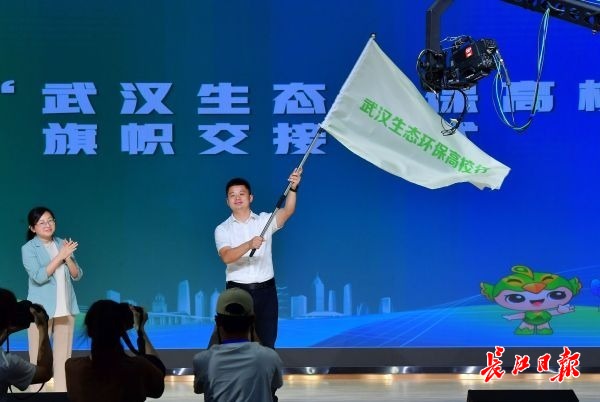 “武汉环保高校行”活动完成授旗。记者刘斌 摄
