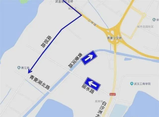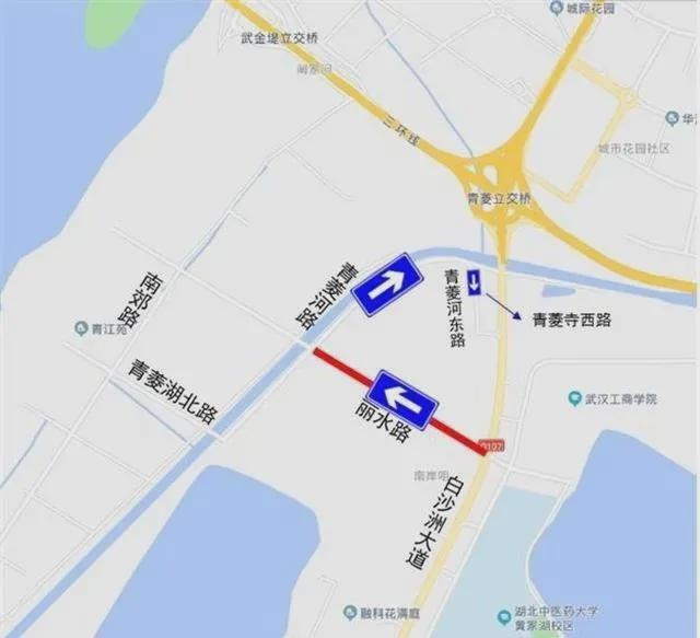 1、原由白沙洲大道往西通过青菱河路进入青菱片区车辆,可通过白沙洲大道、丽水路绕行。