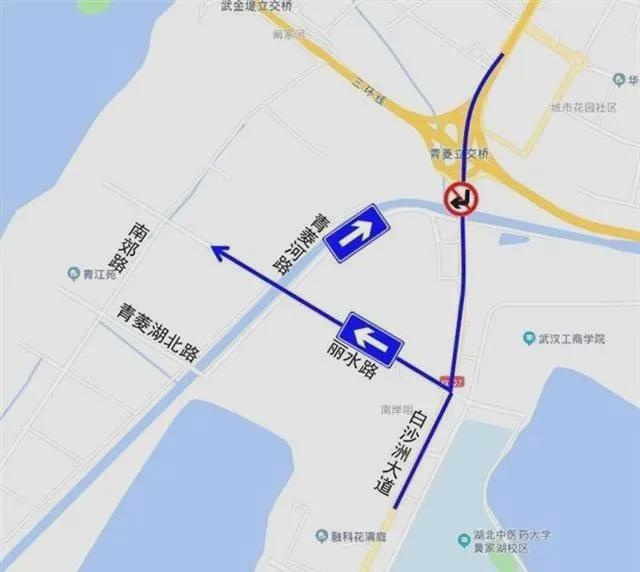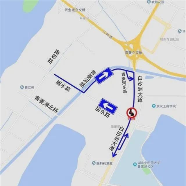 3、原由青菱片区通过丽水路往白沙洲大道方向车辆,需绕行青菱河路至白沙洲大道;通过白沙洲大道往北向中心城区方向车辆,需沿白沙洲大道驶过丽水路路口后,在下一掉头点掉头。