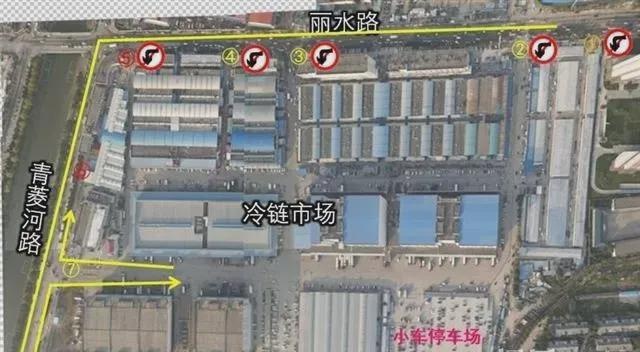 5、冷链市场位于丽水路的1号门、2号门、3号门、4号门、5号门禁止车辆驶入,仅允许车辆驶出,进入冷链市场车辆一律通过位于青菱河路的6号门、7号门驶入。