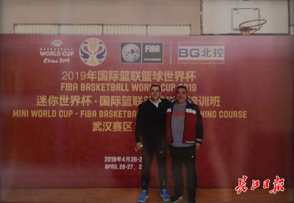 与塞尔维亚国家篮球学院总教练合影。记者彭年 翻拍