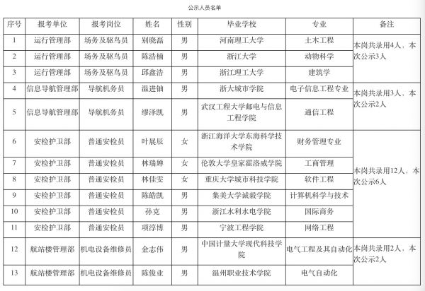近日,温州机场集团发布2023年春季招聘拟录用人员公示名单。其中,浙江大学动物科学专业的陈某被录用为“场务及驱鸟员”;伦敦大学皇家霍洛威学院工商管理专业的林某、白俄罗斯国立大学财务管理专业的洪某为安检护卫部普通安检员。