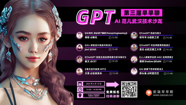 本次公益活动免费报名参加,活动将于6月10日14:00—19:00在武汉理工大学南湖校区管理学院一楼报告厅举办。现场邀请到来自全国各地的GPT好者专家、学者、从业者,与嘉宾观众共同探讨GPT技术的最新发展、应用实践、来趋势、就业机会。名额有限,先到先得。