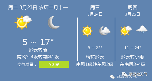 早上好,今天是3月23日,星期二,农历二月十一。武汉天气:多云转晴,温度 5 ~ 17℃,南风3-4级转南风1级,日出时间 06:23,日落时间 18:36,降雨量 0.0mm,湿度 58%RH。实时:多云,气温 5℃,东南风1级,湿度 97%RH,气压 1020Pa,紫外线强度 1级,能见度 6926米。