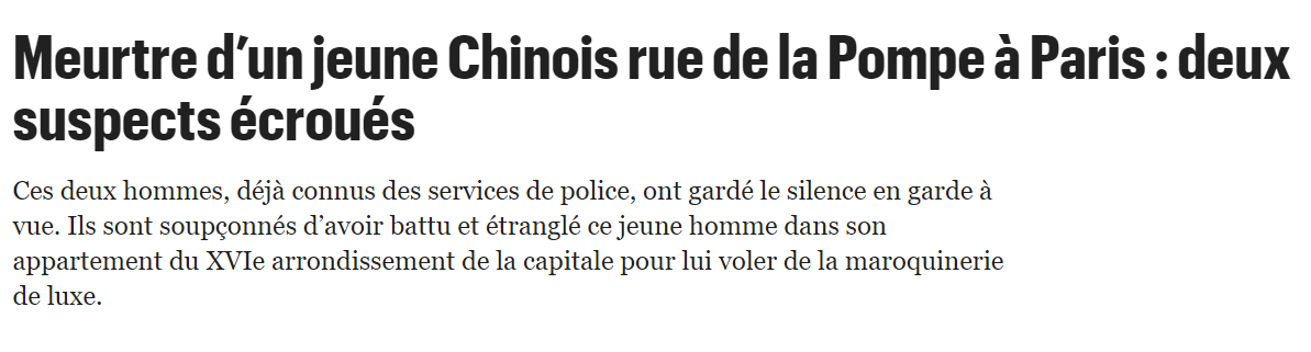 据法国《巴黎人报》6月6日报道,涉嫌在巴黎公寓内杀害25岁中国男子的两名男子已被抓获,并被指控犯有盗窃和谋杀罪。调查发现,受害者很少出门,经常点外卖,在法国没有亲人,家中有许多奢侈品包包,做代购工作。两名嫌犯目前尚未交代犯罪动机和犯罪过程。
