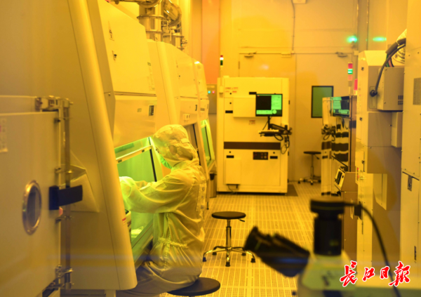 武汉光谷量子技术有限公司的光刻间里,工作人员在黄光环境下安全生产。记者高勇 摄
