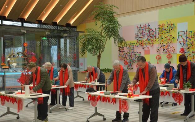 在刚刚过去的牛年春节,有九成居民选择在楚园“就地过年”。春节没有和儿女团聚,长辈们在楚园一样能感受家的温暖。为了让长辈们过个充实年,楚园在春节期间活动精彩不断,并持续至元宵节。除夕前,几位擅长书法的长辈挥毫洒墨,书写百余幅“福”字和春联。大年三十,楚园社区总经理朱旭和管理团队一起,为每家每户贴对联、送祝福。除夕夜,泰康之家•楚园洋溢着欢乐的年味。楚园餐饮将娱乐设施搬到餐厅,大家围坐一起看春晚、包饺子、打麻将,笑声不断。“我第一次春节守岁到凌晨,开心得舍不得睡。”许叔叔说,在楚园过年很幸福。