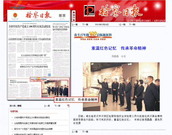 媒体关注 | 《检察日报》刊登:重温红色记忆 传承革命精神 2021-03-24 21:12 汉阳检察 0 日前,湖北省武汉市汉阳区检察院组织全体检察人员分批前往武汉革命博物馆探寻革命兴起路,学习党的历史、重温红色记忆。 来源 | 检察日报