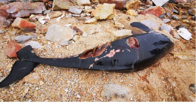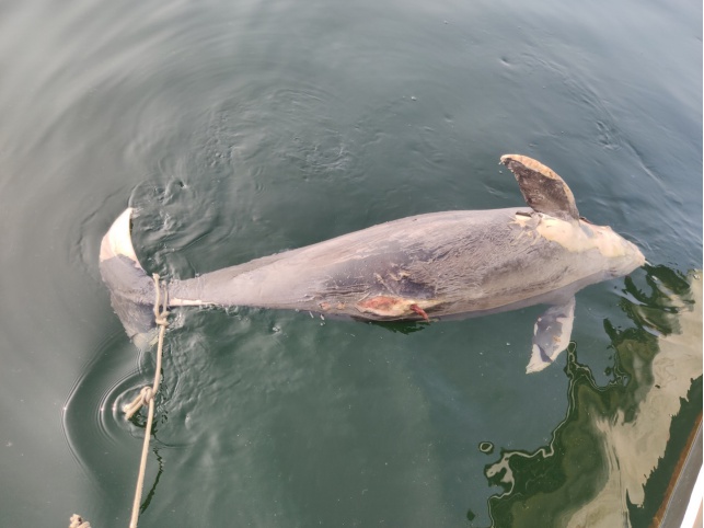 3月23日,一只伤痕累累的江豚在深圳东部海滩上被发现已死亡。