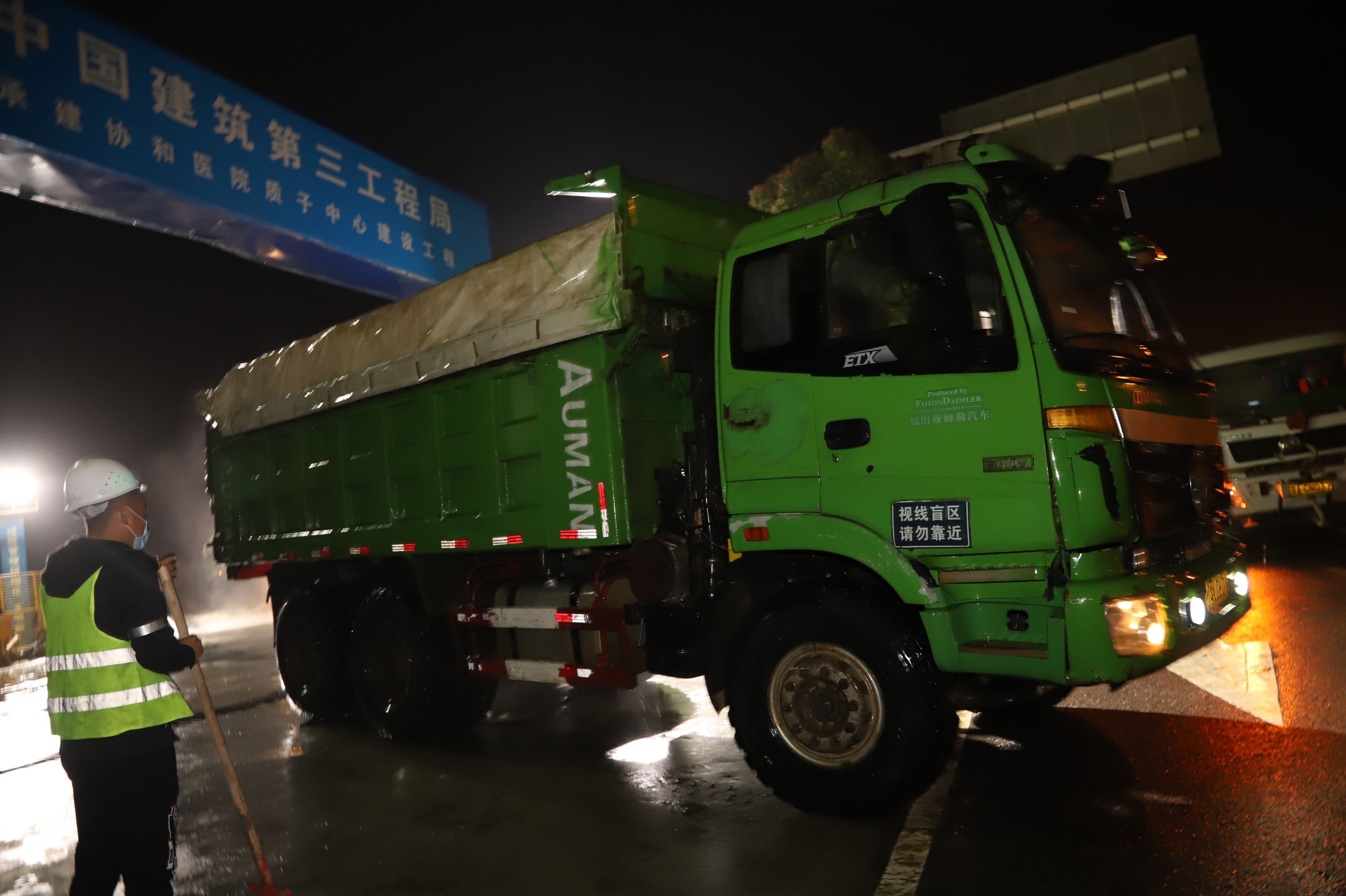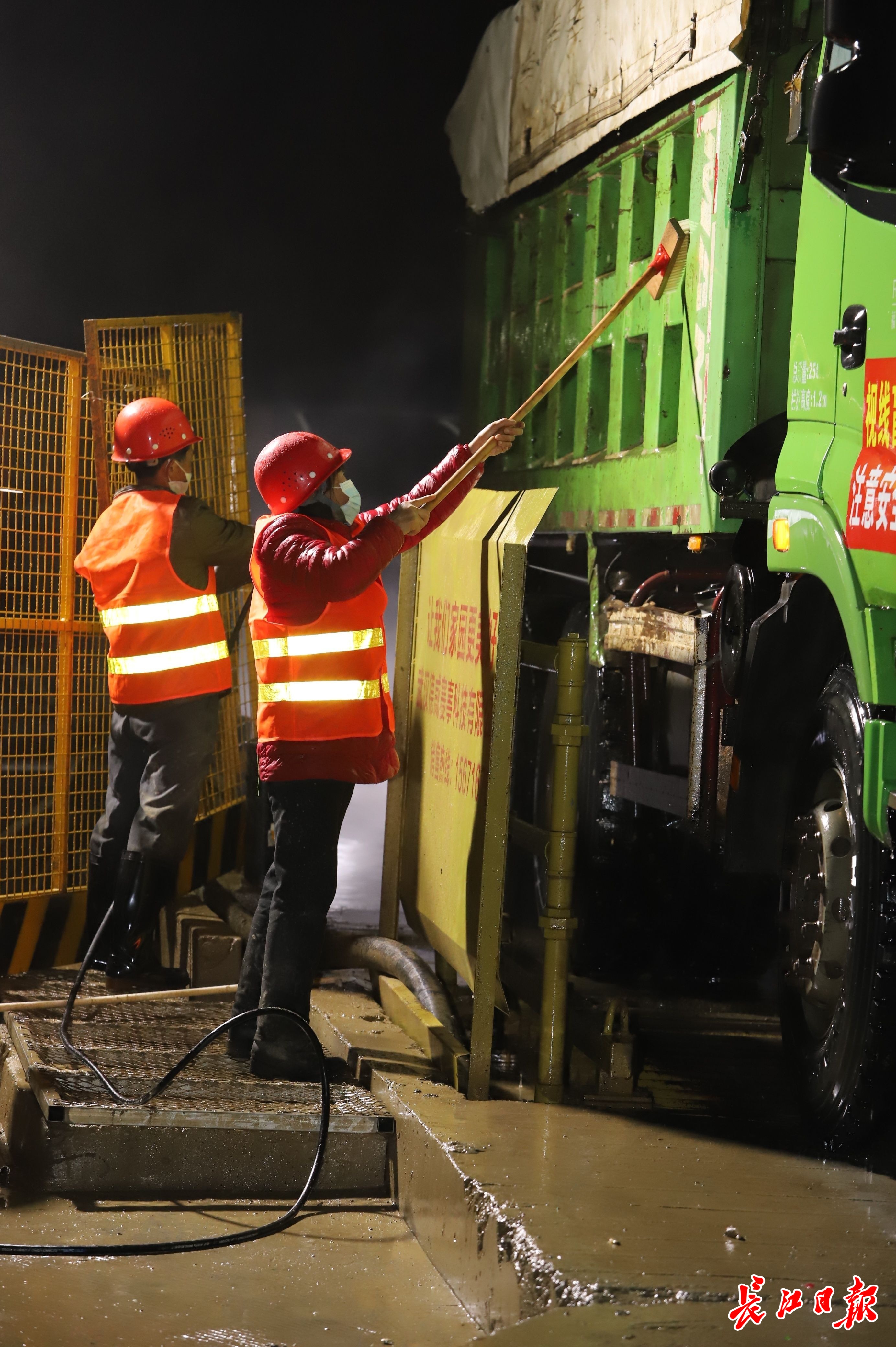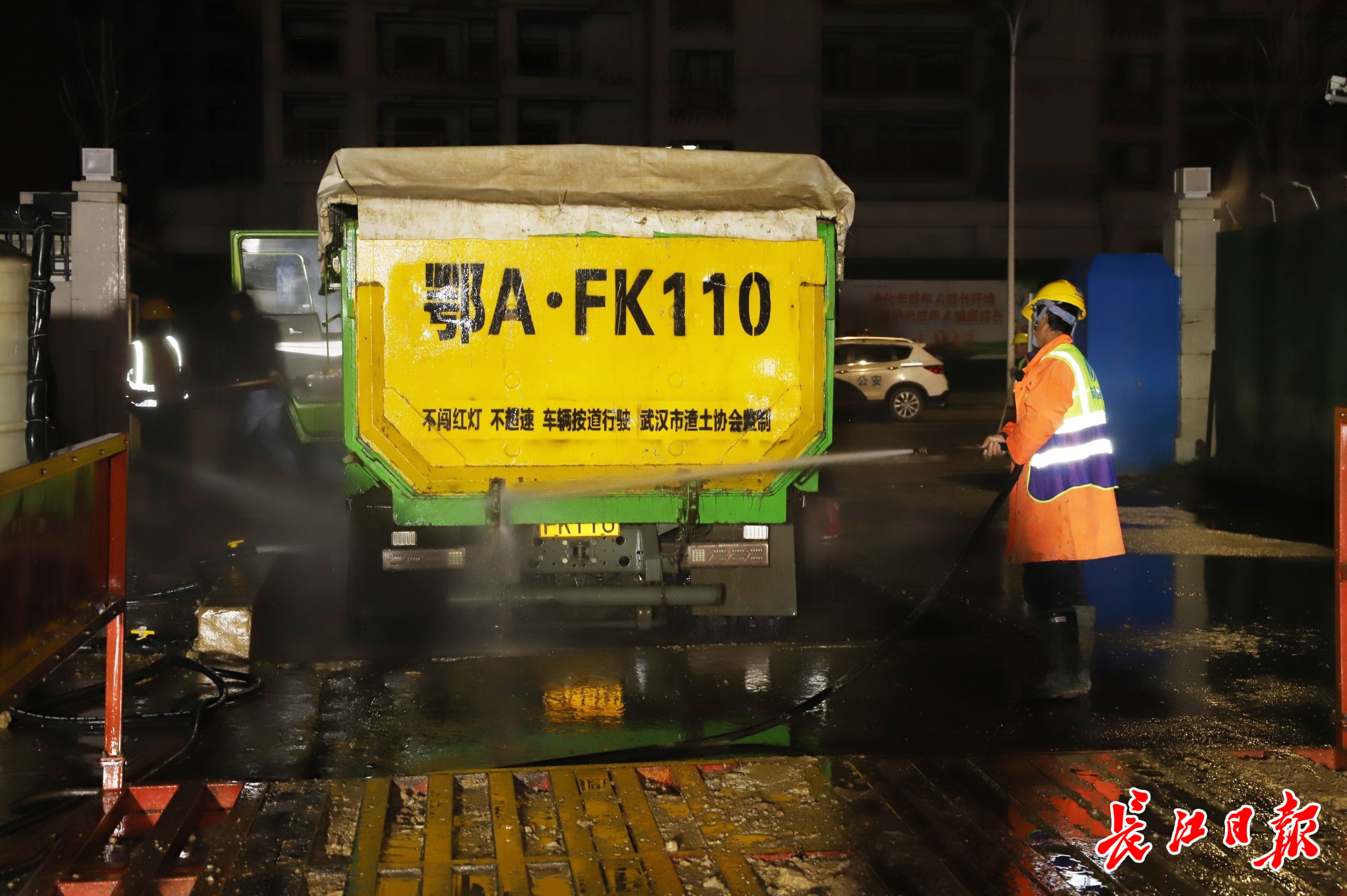 在东西湖区人民医院综合住院楼三期项目工地,一辆渣土车先后经过双洗车槽、自动冲洗平台和高压水枪专人冲洗后,车轮、车身已干干净净,正准备出场。