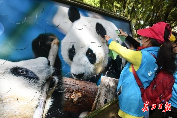 市民欢送会玩大熊猫拼图。长江日报记者詹松 摄