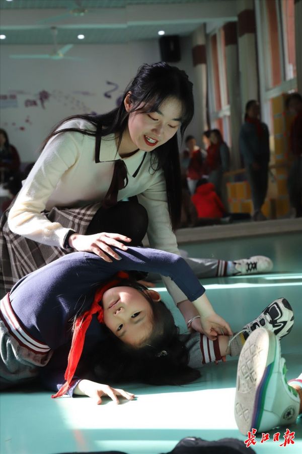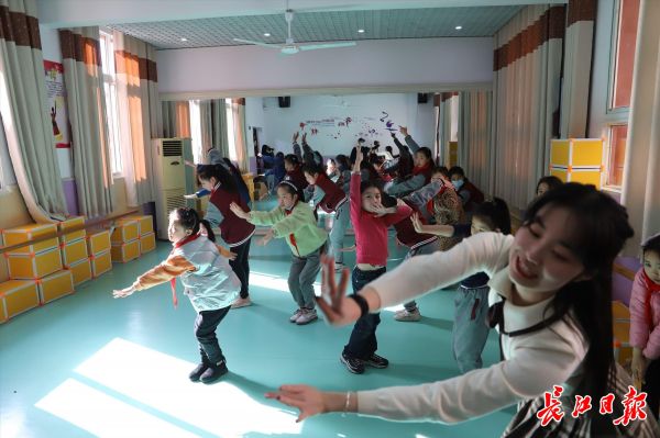 湖北大学团委文化艺术中心的队员为孩子们教授舞蹈课。