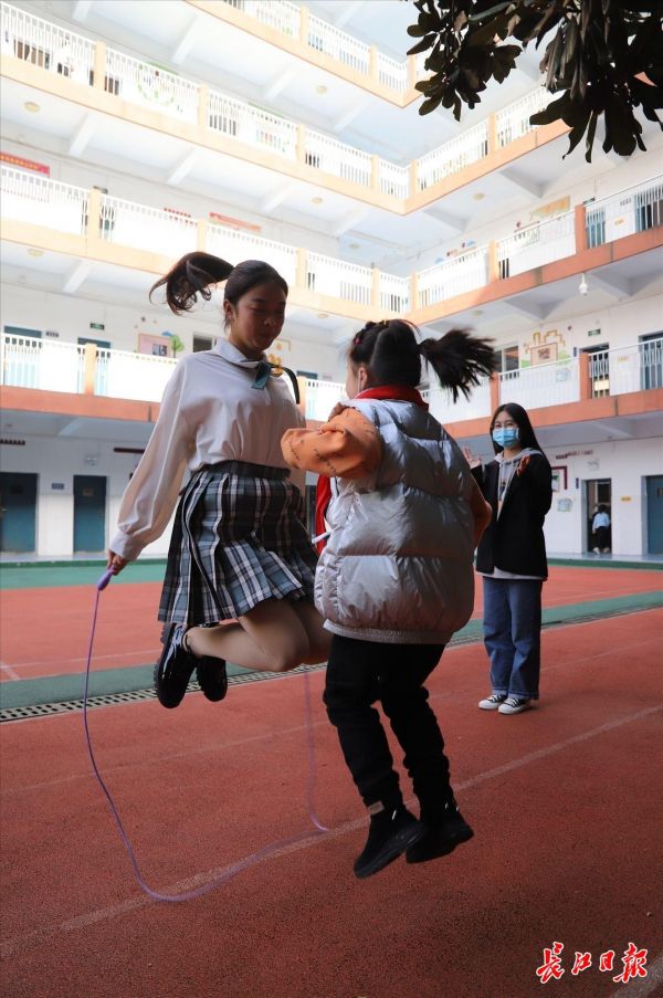“小白杨”志愿者和孩子们课间一起跳绳。