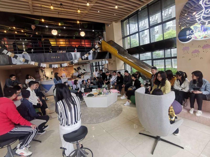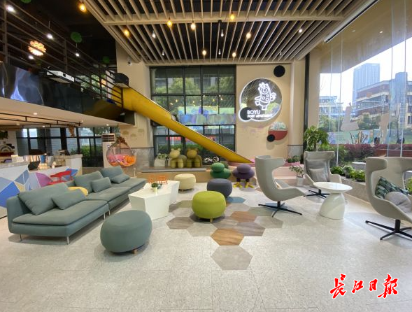 “所有人一进来都会被这个滑梯吸引注意力,刚开业它就成了我们这里的网红打卡点。”武汉泊寓总经理张凝波介绍,这里日常可以举办很多活动,沙龙讲座、手游比赛、音乐会、手作DIY等,而在日常的公寓生活中,每周五电影日还会在大堂的大屏幕上播放热门电影。有时,有些租客会自发组织其他租友在这里玩狼人杀、剧本杀等桌游。