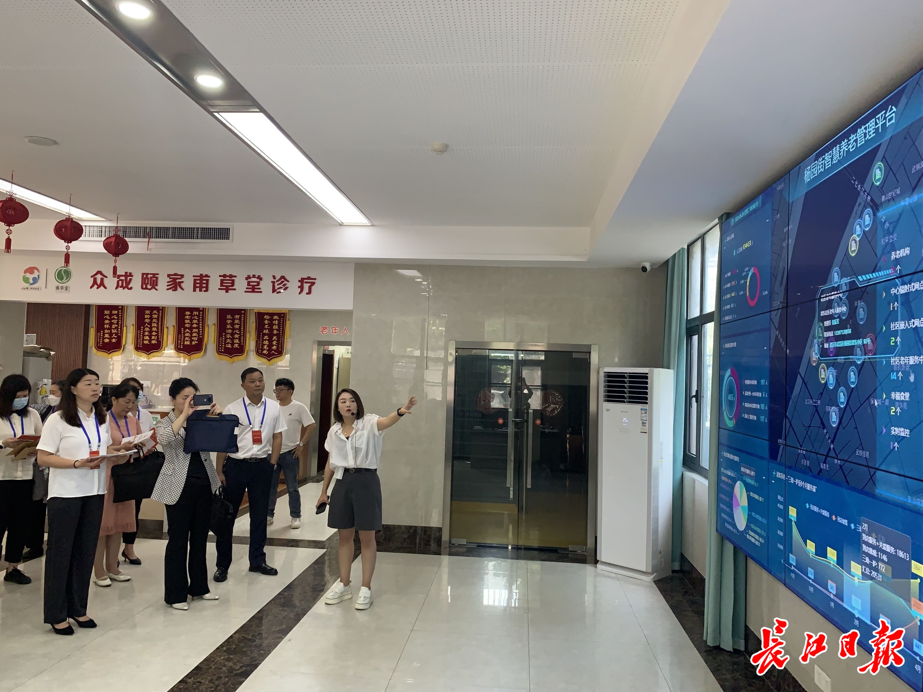 当天,评议员一行11人首先来到武昌区杨园街道四美塘众成颐家颐养中心,调研社区居家养老服务工作。该中心形成了较为成熟的“互联网+专业看护+社区+家庭”相结合的智慧居家社区养老服务模式。在服务大厅的街道智慧养老管理平台上,实时显示养老服务对象健康情况、“三助一护”(助餐、助洁、助医和远程照护)服务工单等数据。评议员走进智慧养老展示厅,参观体验一键通应急呼叫器、非接触生命雷达、智能健康监护仪、老人安全智能报警器、门磁等智能终端运行状况。