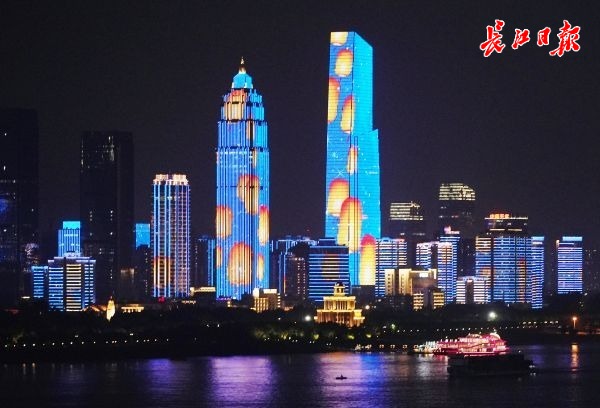 端午期间的长江灯光秀分为《龙腾粽海》《高山流水 白云黄鹤》两个部分。当夜幕四合,两江四岸的建筑群上祥云密布,楚国的高台建筑、展翅的仙鹤点缀其中。随后孔明灯缓缓升起,只见来汉口江滩散步的小姐姐拉着同伴一起合影,笑着说道“许个愿吧”。