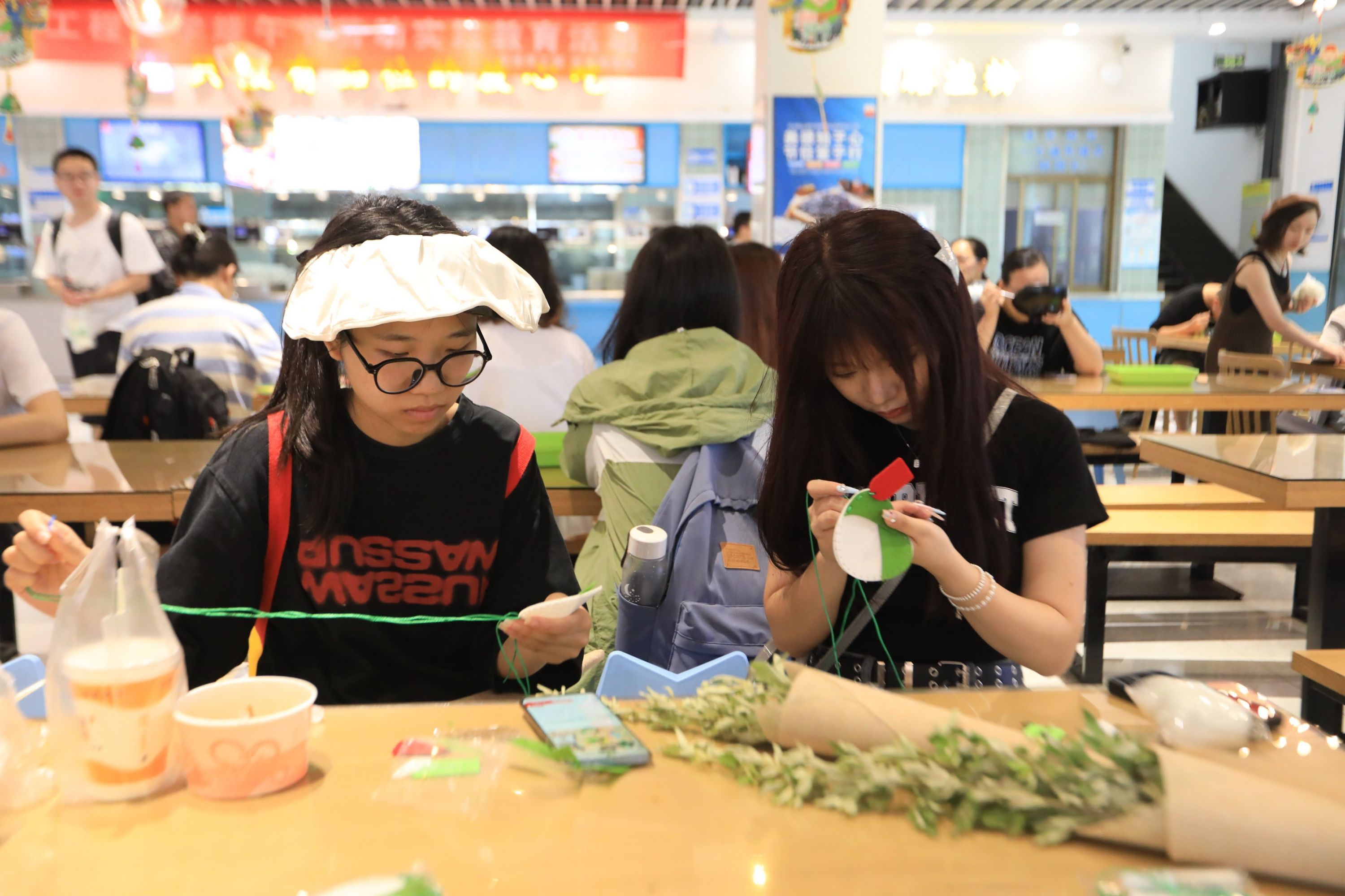 上午9时,流芳校区中快食堂吸引了近一百余名师生和校领导一同体验包粽子、制作香囊、制作艾草花束。九歌汉服社的成员周子瑛表示:“大家聚在一起包粽子,节日气氛特别浓厚”