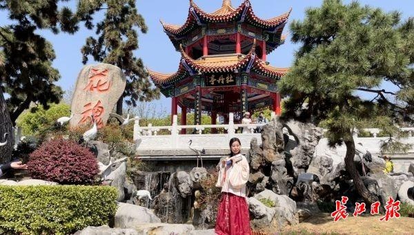 在牡丹亭处,游客弯月(化名)身穿中国传统服饰,手持传统书卷在牡丹花前摆着造型,她告诉长江日报记者,此次是专程精心打扮前来赏牡丹的,“牡丹不同于其他许多花,它有着浓郁的中国元素,我今天穿了一身汉服,想以汉服的形式表现中国传统文化”。游客江女士则携友人在东湖牡丹园里赏花观景:“我很喜欢花,这里的牡丹开得很漂亮!”家住东湖畔的胡女士则带着94岁高龄的母亲,也来到这里,“因为是工作日,今天游园的游客大多年纪比较大,他们都很有兴致,赏花、跳舞、拍抖音,老有所乐了!”她说,武汉是个四季分明的城市,这也让武汉更具吸引力,“我刚从外地旅游回来,还是觉得家乡武汉美,今年的武汉格外美!”