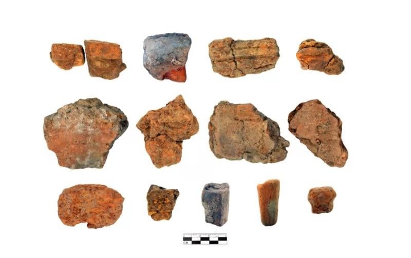 此次发掘发现的商代冶铸遗物有熔铜器具、生产工具、原料、陶范以及燃料等。出土的坩埚壁残块200余块,个别可以复原器形。此次出土的陶范共计500余块,保存较差,有外范、芯范两类,可辨器形有罍、斝及生产工具等,出土其他铜质、石质生产工具共计200件。
