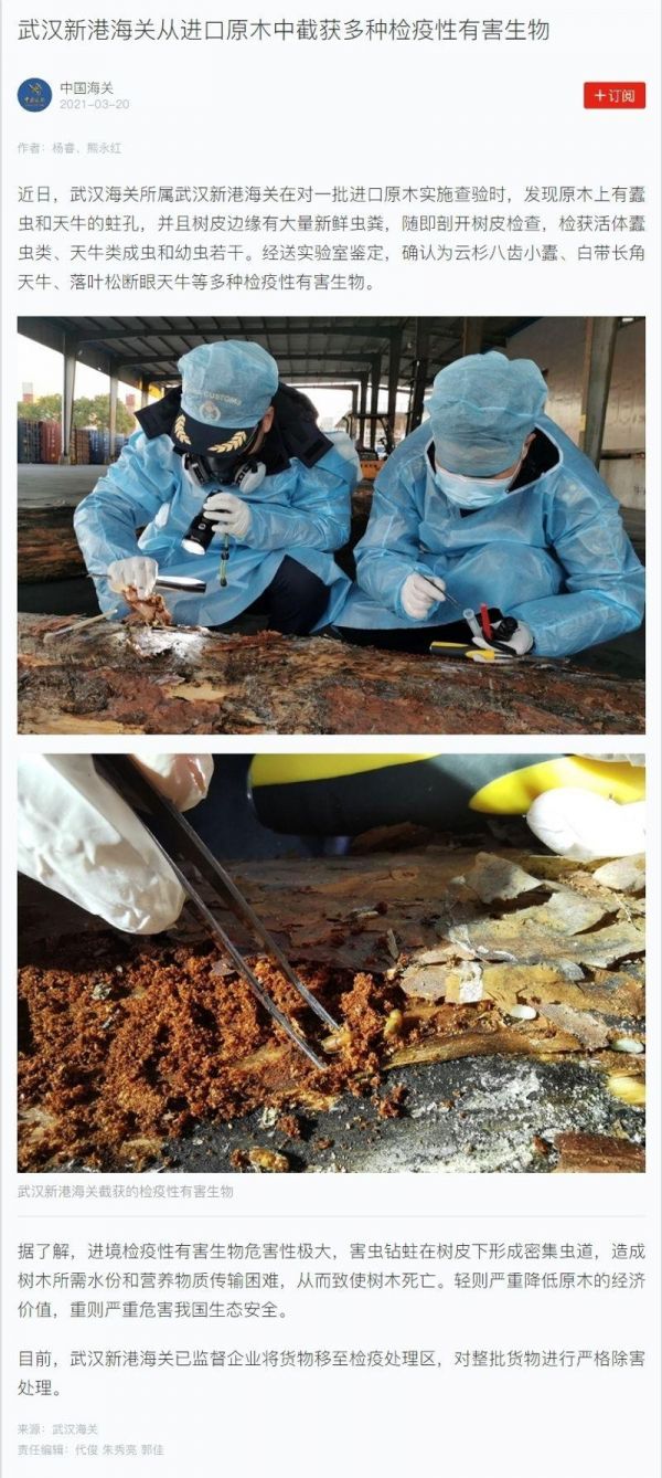3月20日“中国海关”强国号:武汉新港海关从进口原木中截获多种检疫性有害生物