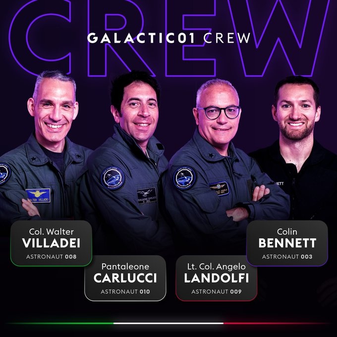 首次商业太空飞行共有4名乘客,其中包括3名来自意大利空军、意大利国家研究委员会的付费客户和一名维珍银河宇航员教练科林·贝内特(Colin Bennett)。