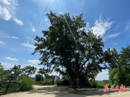 山岗木咀湾村口处,生长着一棵高10余米、三人环抱粗细的大树,树上挂着“武汉市古树名木”保护牌。牌子显示:这是一棵枫香树,2022年,武汉市园林和林业局对其挂牌实施3级保护,当时树龄263年。
