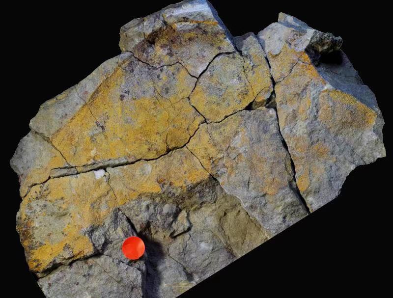 2020年5月,因疫情影响,刘一龙滞留在老家。听闻他经常去的武汉洪山古姆山一处刚刚施工完毕,四周有不少堆砌的碎石,他料到这是一个“寻宝”的好机会,于是和在武汉的朋友联系,以视频的方式寻找化石。敲敲打打中,突然在一块岩石上发现了一大片黄褐色斑点,上面还有很多小凹坑。他眼前一亮,用丰富的古生物知识判断出这可能是一块鱼类化石。