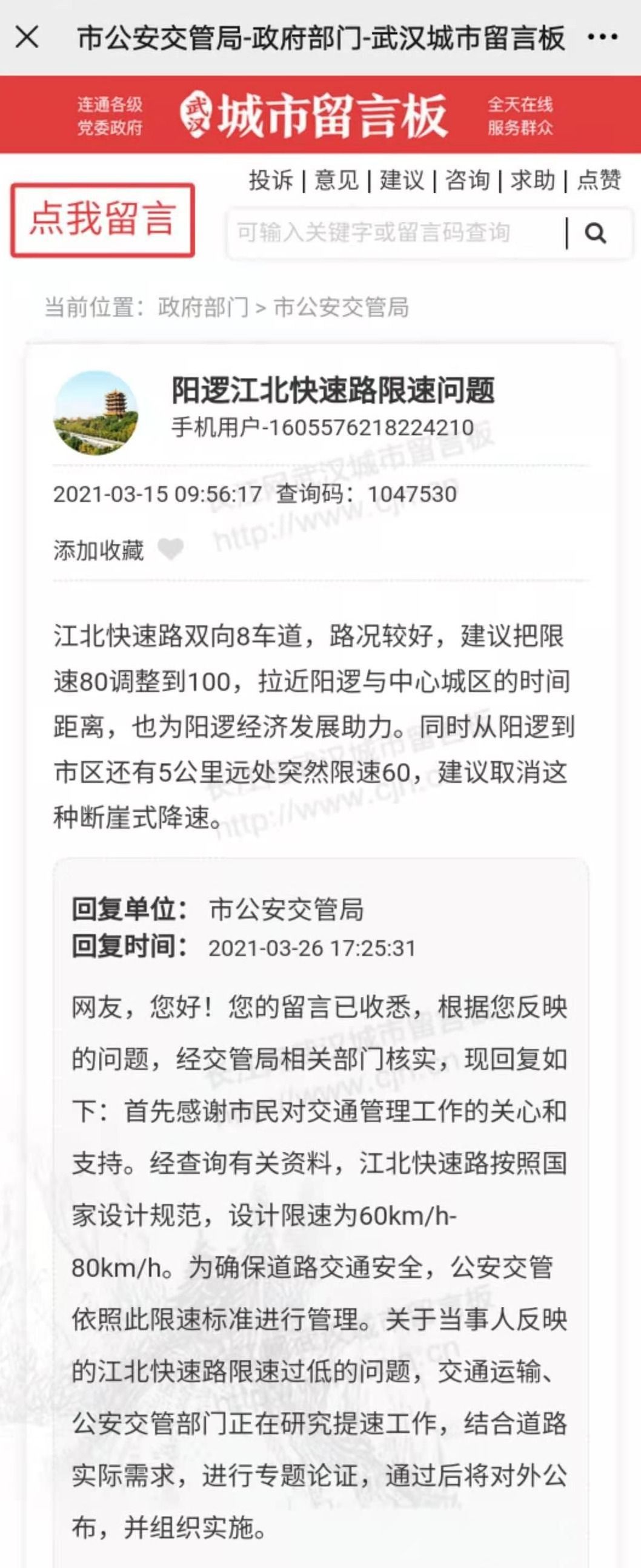 近日,一位市民在长江网武汉城市留言板建议将江北快速路限速适当提升,拉近中心城区与新洲的距离。市公安交管局回复,交通运输、公安交管部门正在研究提速工作。详见>>