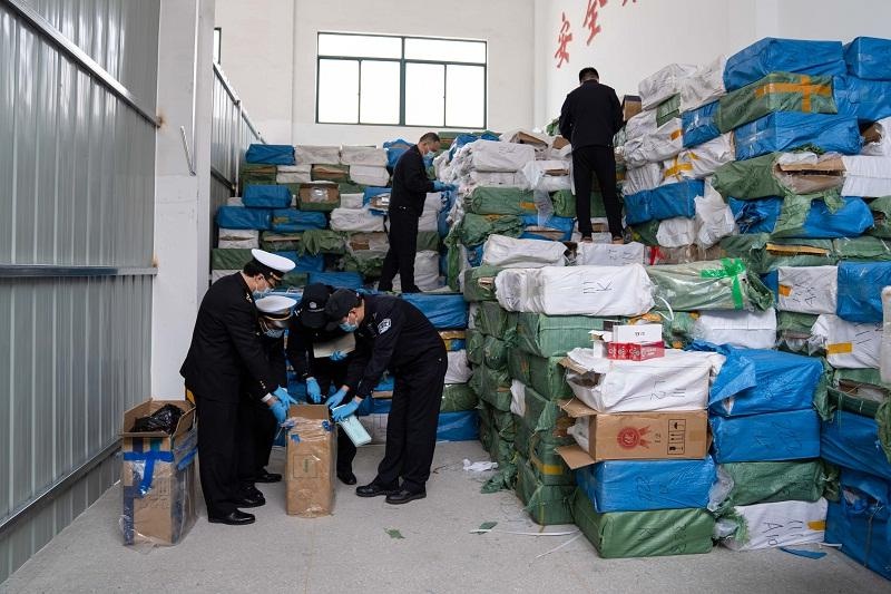 图为:办案人员开箱查验走私香烟 杨阳/摄