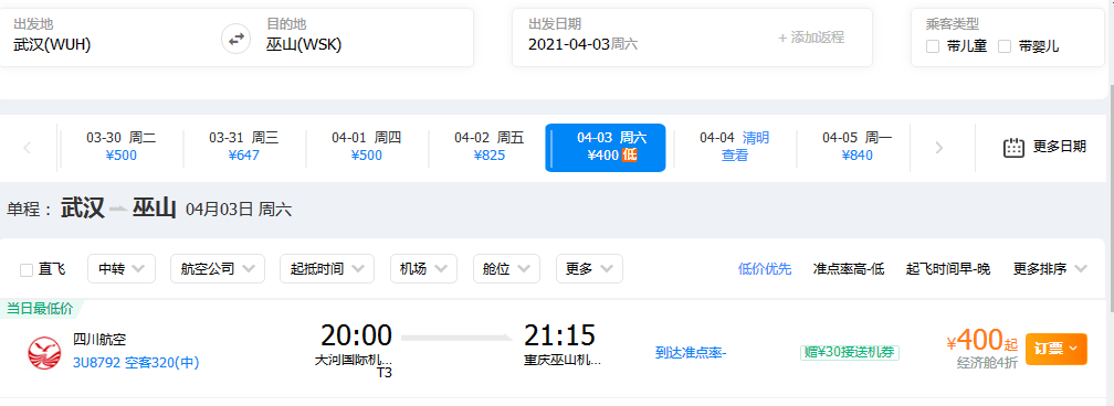 长江日报3月30日讯 长江日报记者获悉,3月30日起,巫山机场开通成都—巫山—武汉航线,这意味着,武汉游客可打飞的1个多小时到达重庆巫山各景区。
