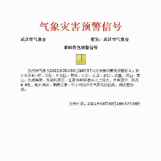 武汉市气象台30日16点37分发布暴雨黄色预警信号:预计未来6小时,汉阳、开发区、蔡甸、江汉、江岸、硚口、武昌、洪山、青山、东湖高新、东湖风景区、江夏将有50毫米以上降水,伴有雷电,阵风6-8级,城乡渍涝、地质灾害、中小河流洪水气象风险较高,请注意防范。
