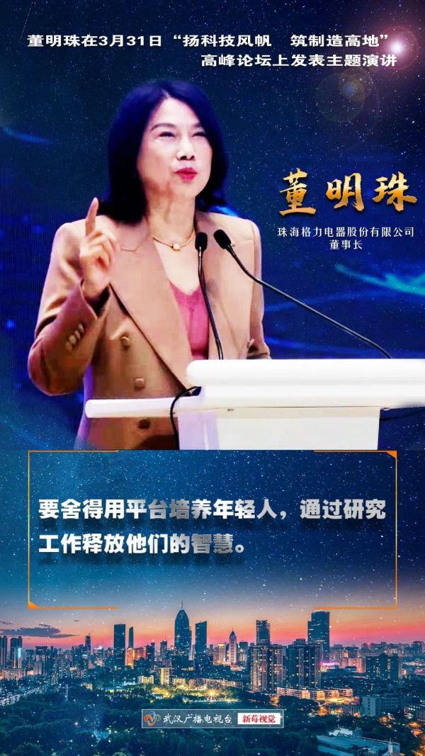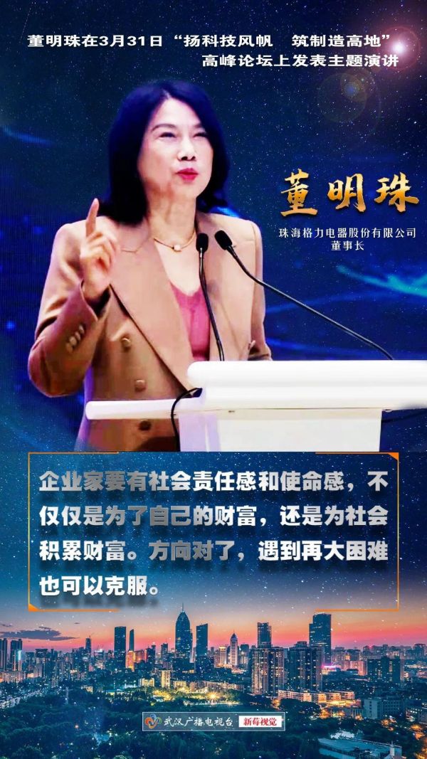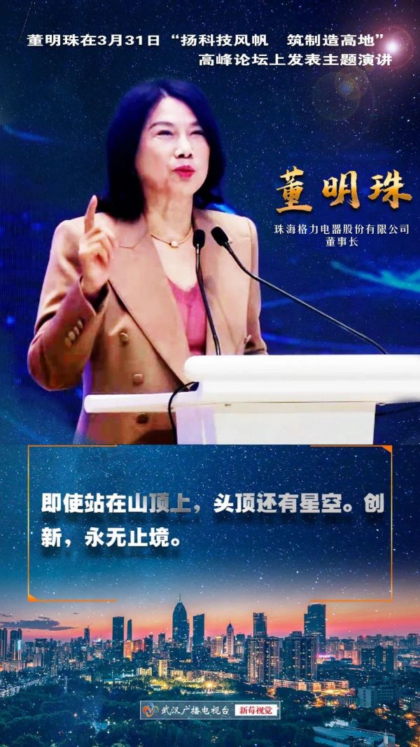 3月31日,“扬科技风帆 筑制造高地”高峰论坛在汉召开,珠海格力电器股份有限公司董事长董明珠在会上发表主题演讲。