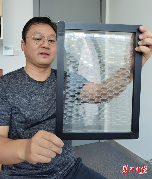 胡彬教授和他设计的剪纸薄膜窗。记者杨佳峰 摄