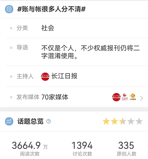 长江日报发起的微博话题“#账与帐很多人分不清#”登上全国热搜,阅读量已超过3600万人次。