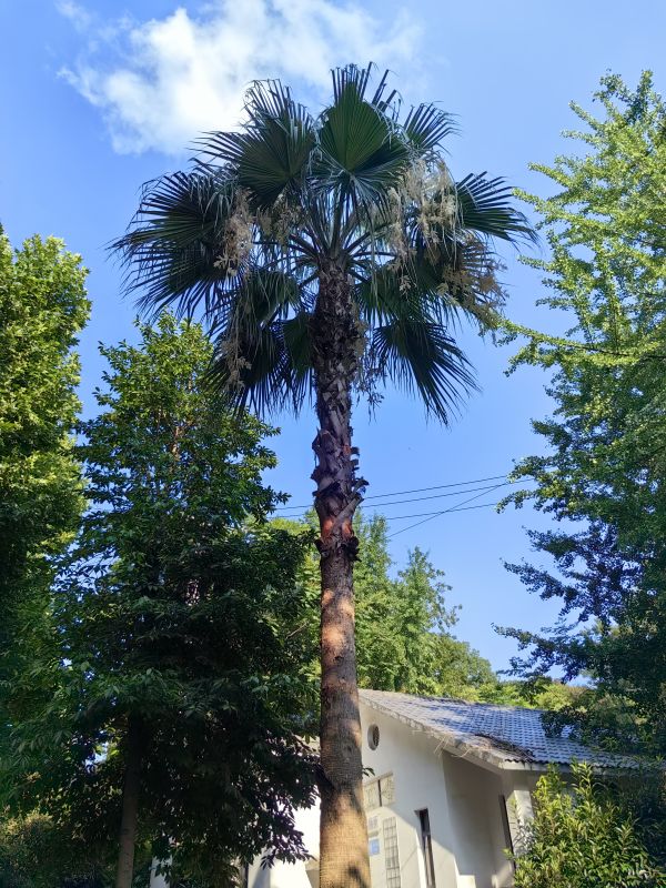 外形跟棕榈一样,只是比普通的棕榈高大很多,为什么开的花不一样呢?“这两株‘棕榈’其实是老人葵,是棕榈科银棕属乔木,是一种南方植物。它的树干极不平滑,上面有干枯树叶的残留,就像老人的胡子一样,所以叫做老人葵。可作行道树、景观树,可单植、列植、群植,观赏价值极佳。”