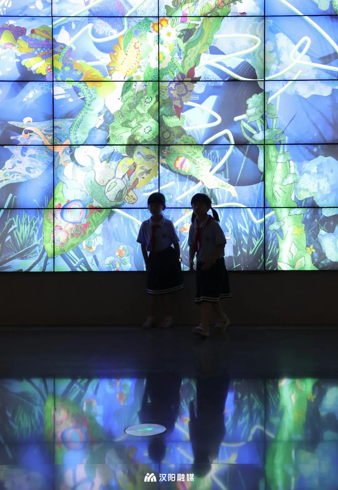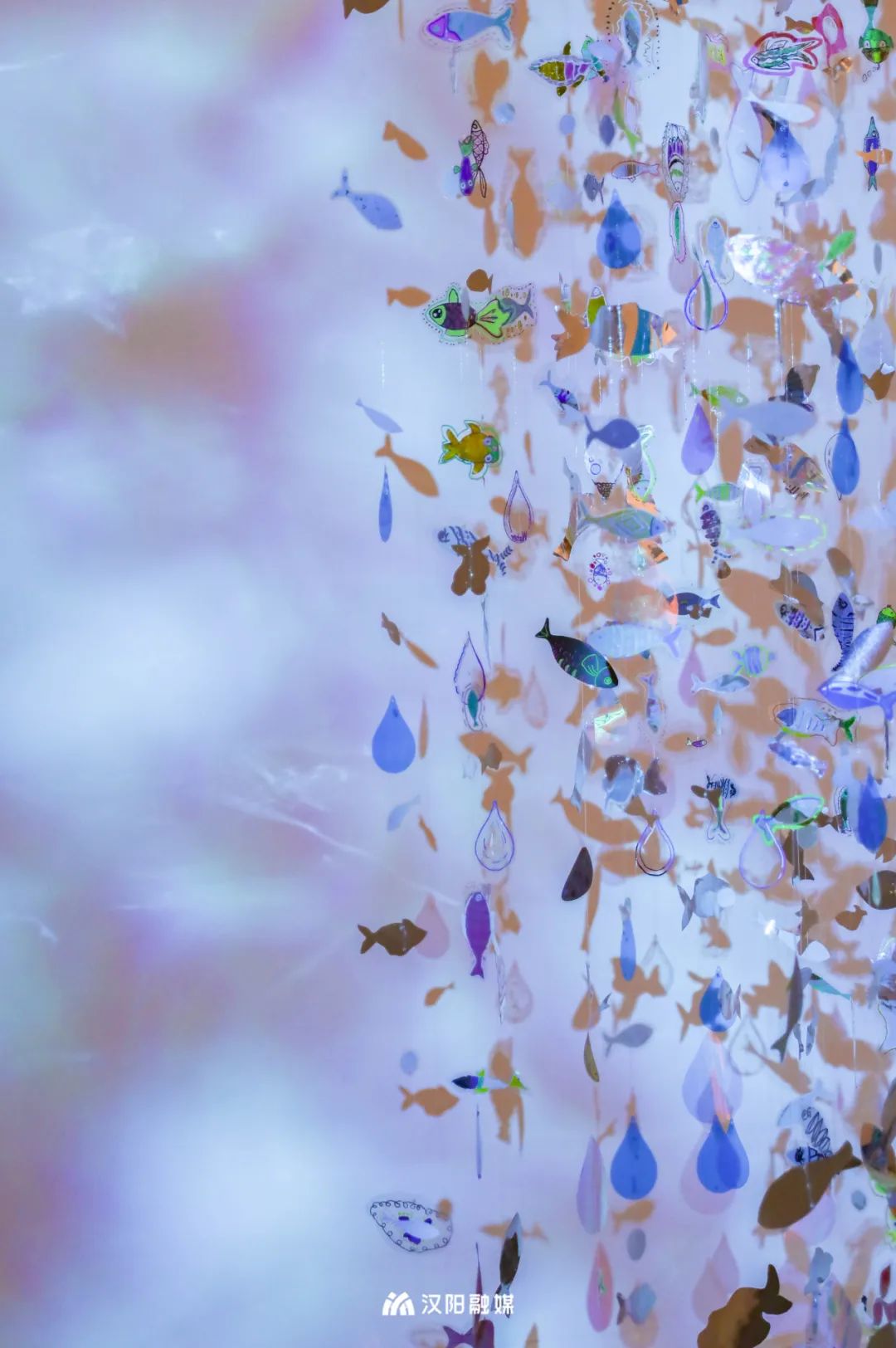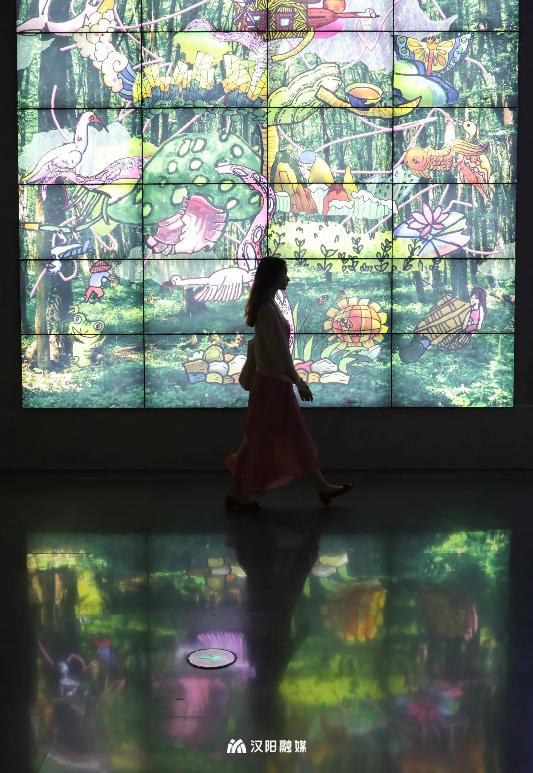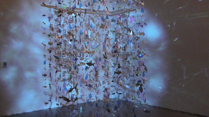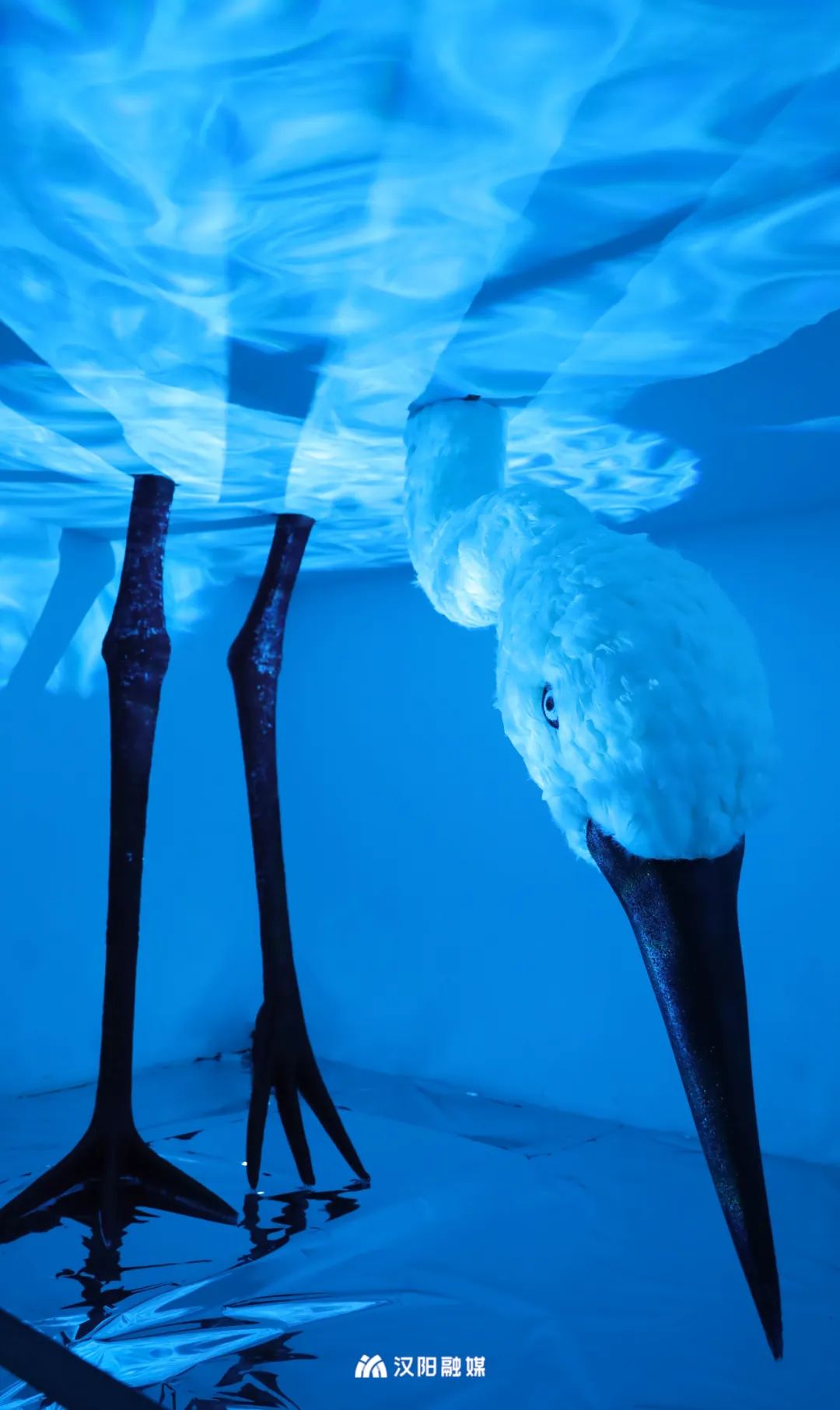 其中,作品《生长之声》、《鲸落之鸣》由武汉聋哑学校、湖北美术学院实验设计学院和艺术家鞠腾共同完成,用图像表达创作者心中对声音的幻想。角落小型展厅内,沉浸式装置作品《觅》展出,观众可以看到一只鹳在水下觅食的样子,栩栩如生,梦幻十足。