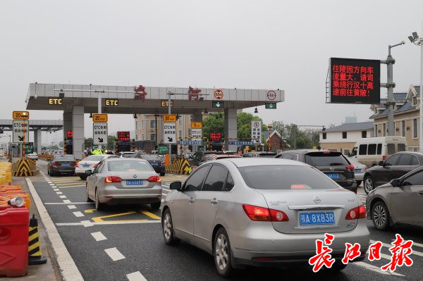 4月3日上午9时,在岱黄高速府河收费站前,出城的车辆排起约500米的长队。长江日报记者杨涛 通讯员张振宇 高航 摄