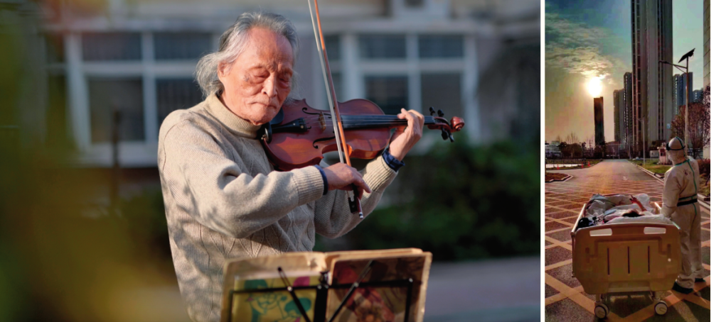 2020年3月5日傍晚,在武汉大学人民医院东院,复旦大学附属中山医院湖北医疗队的刘凯在护送87岁的患者王欣做CT的途中停下,让住院近 1 个月的王欣欣赏久违的落日。一年之后,89 岁的王欣重搭弓再抚弦 左图:熊琦摄 / 《瞭望》新闻周刊右图:甘俊超摄 /《瞭望》新闻周刊