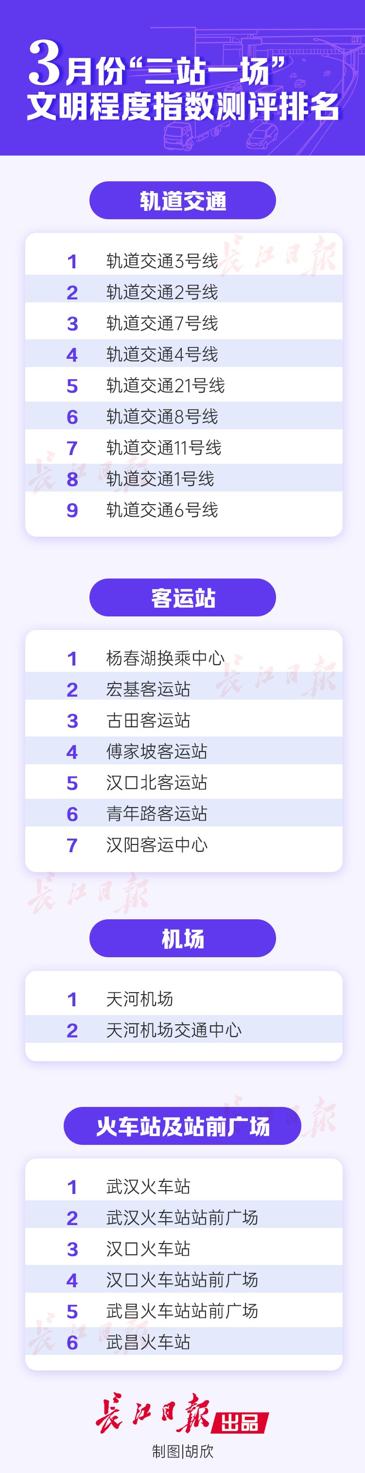 长江日报4月5日讯 4月5日,市文明办、市交通运输局公布了3月份“三站一场”(长途汽车站、火车站、地铁站和飞机场,简称“三站一场”)文明程度指数测评排名。测评结果显示,各类场站综合排名第一的分别是轨道交通3号线、杨春湖换乘中心、天河机场、武汉火车站。