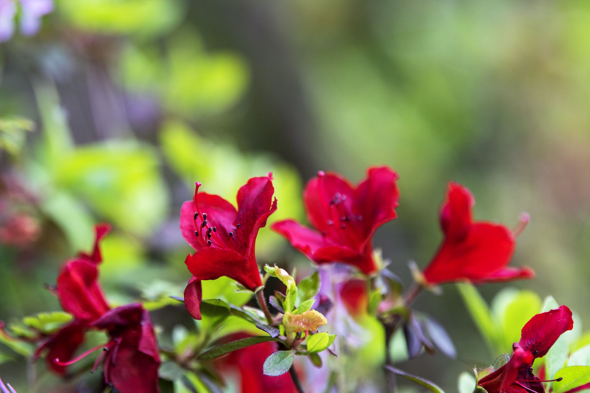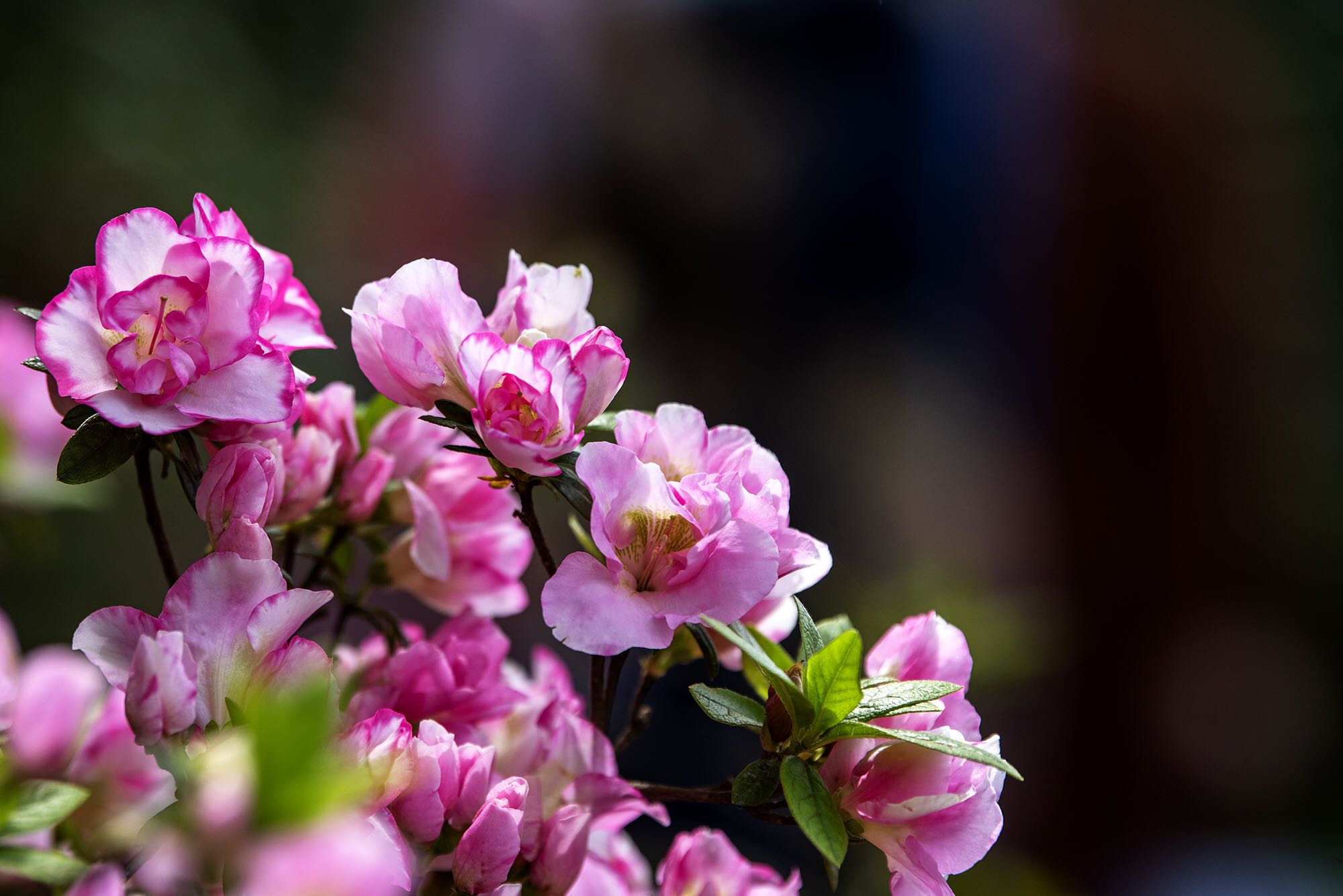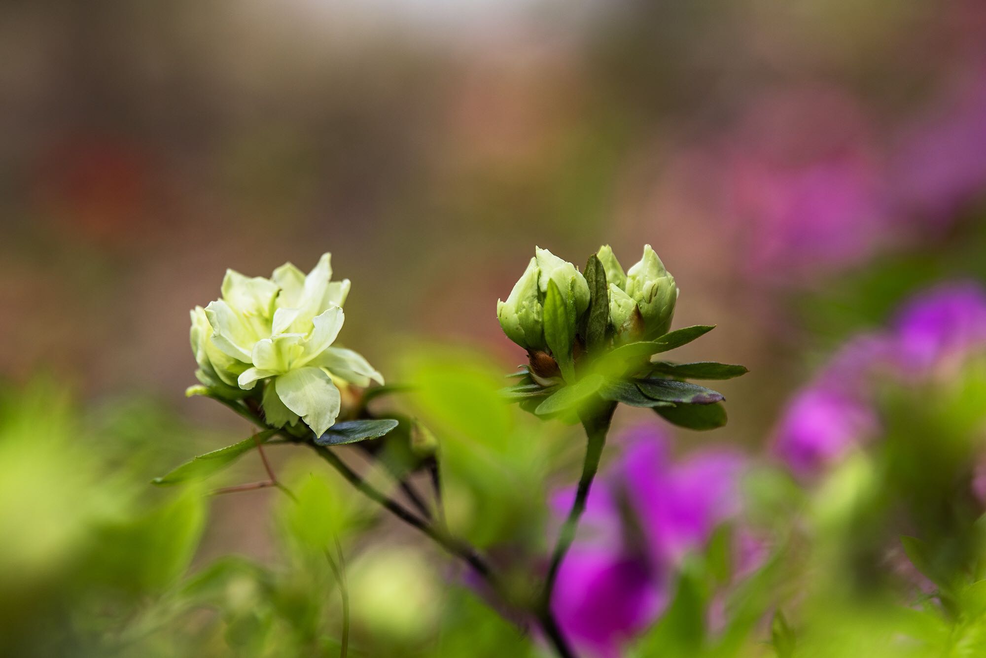 武汉植物园的杜鹃除红色、紫色、粉色、白色等单色外,还有绿色杜鹃和复色杜鹃花。从国外引进的绿色杜鹃品种‘绿色光辉’,花朵小巧玲珑,色如碧玉,十分罕见。复色杜鹃‘皇冠’花朵白粉相间,粉红色镶边,素雅又不失颜色,一扫杜鹃的艳丽姿态,既清新又迷人。