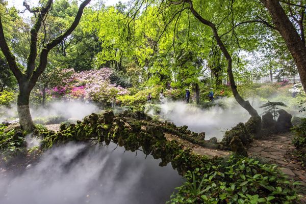 长江日报记者漫步在杜鹃园,只见林深景幽、小径蜿蜒、繁花似锦。杜鹃园一旁的水云涧设有人造雾喷和涌泉,飘忽不定的雾霭在花丛林隙间弥漫,营造出迷雾笼罩的林涧意境,映衬着周围红艳艳的杜鹃,宛如人间仙境。