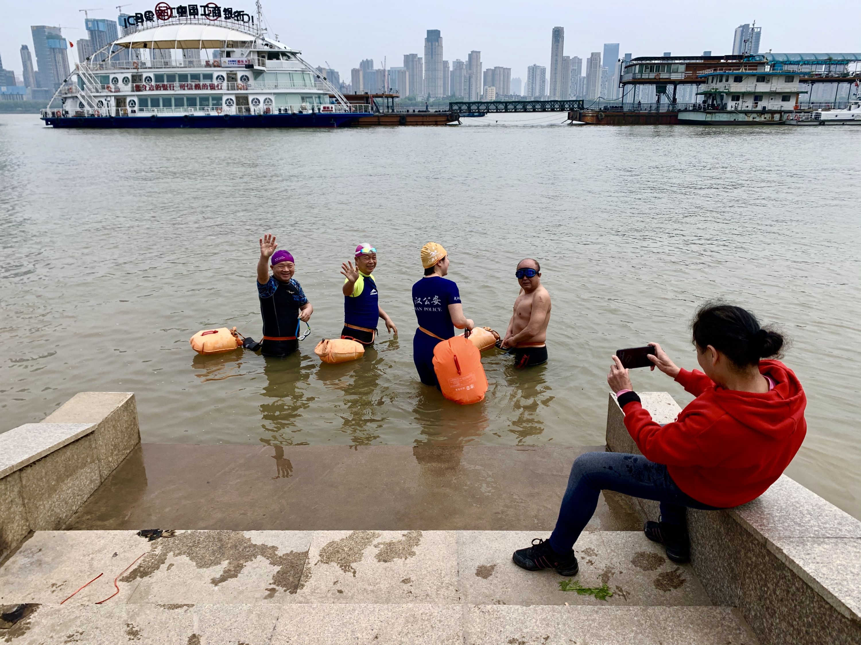 8日中午12时30分,汉口江滩,游泳爱好者正准备下水。城市摄影队雨洒江天 摄