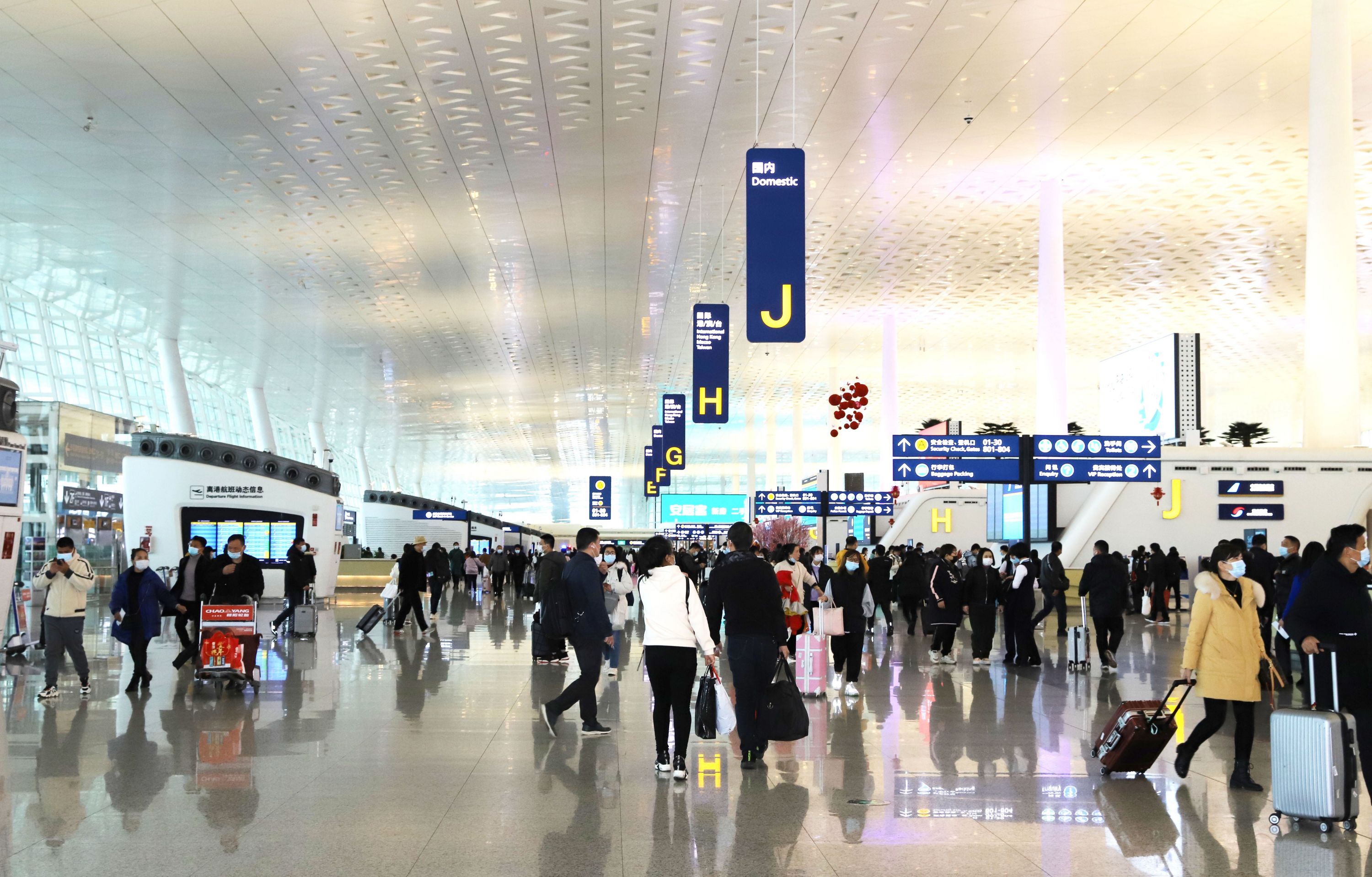 天河机场内,旅客有序进入航站楼办理值机和托运。