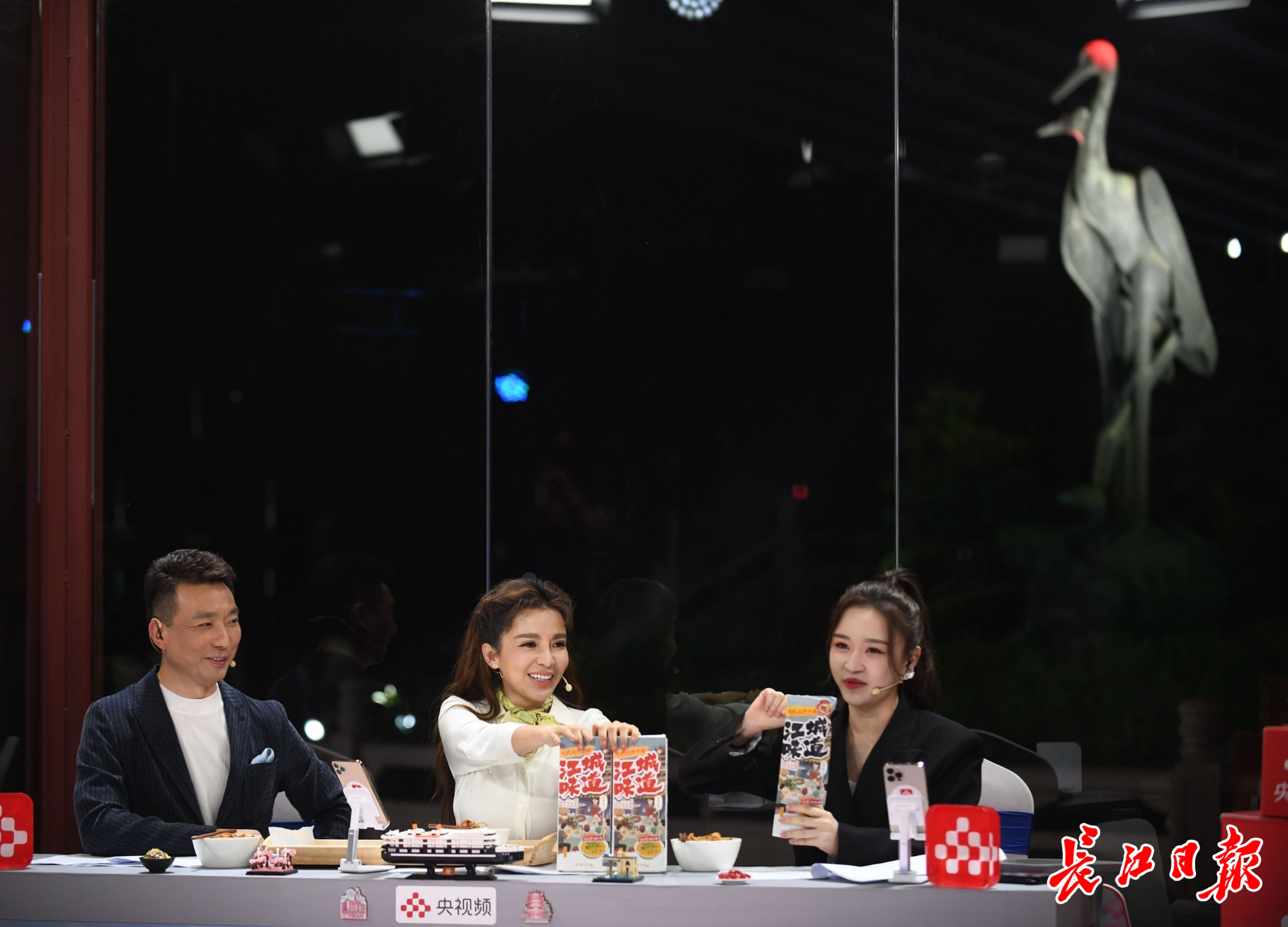 8日晚,武汉黄鹤楼下,中央广播电视总台知名主持人康辉(左)、朱迅(中)和网络主播雪梨组成带货天团,为湖北公益带货。长江日报记者苗剑 通讯员江萌 摄