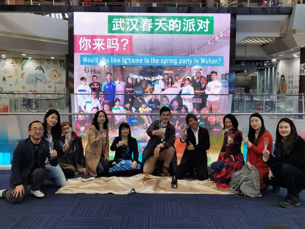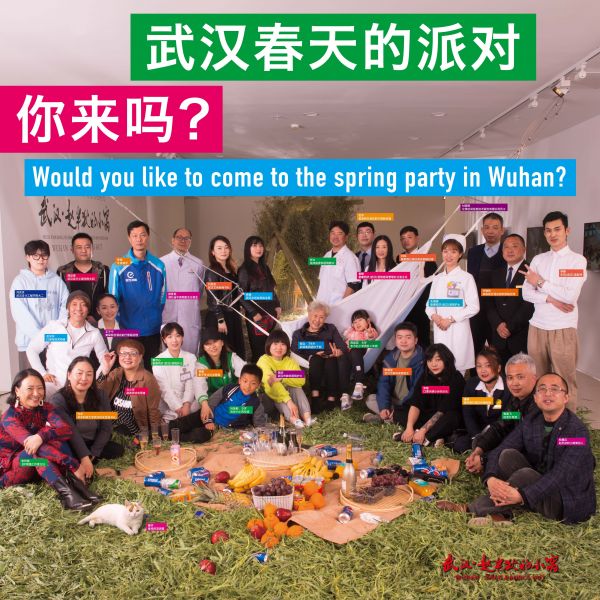 《春》公共海报以近期在武汉美术馆展开活动的《武汉·赵半狄的小窝》为背景,三十来位各行各业的武汉市民站在口罩形吊床前,迎接武汉的春天,向全国的观众发出邀请“武汉春天的派对,你来吗?”。