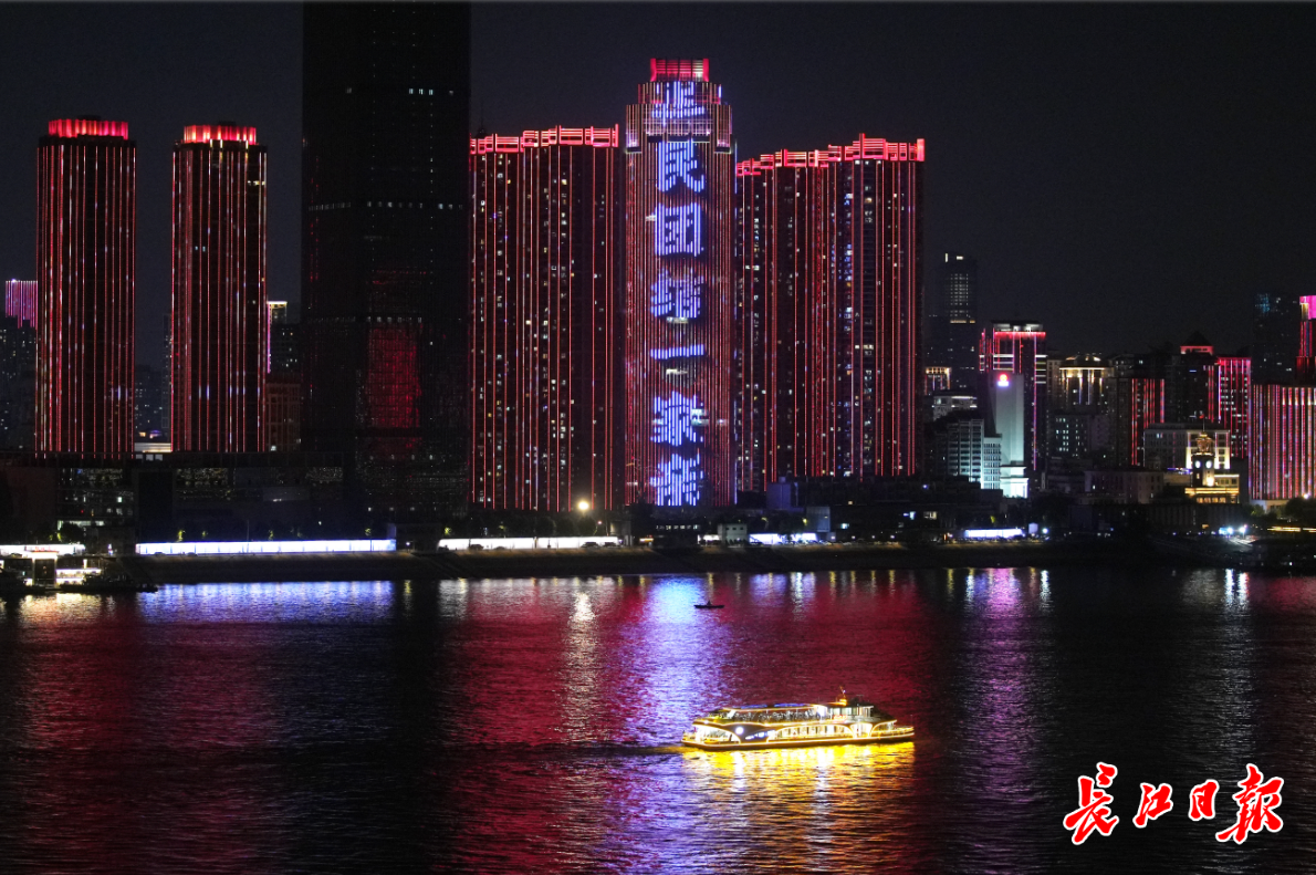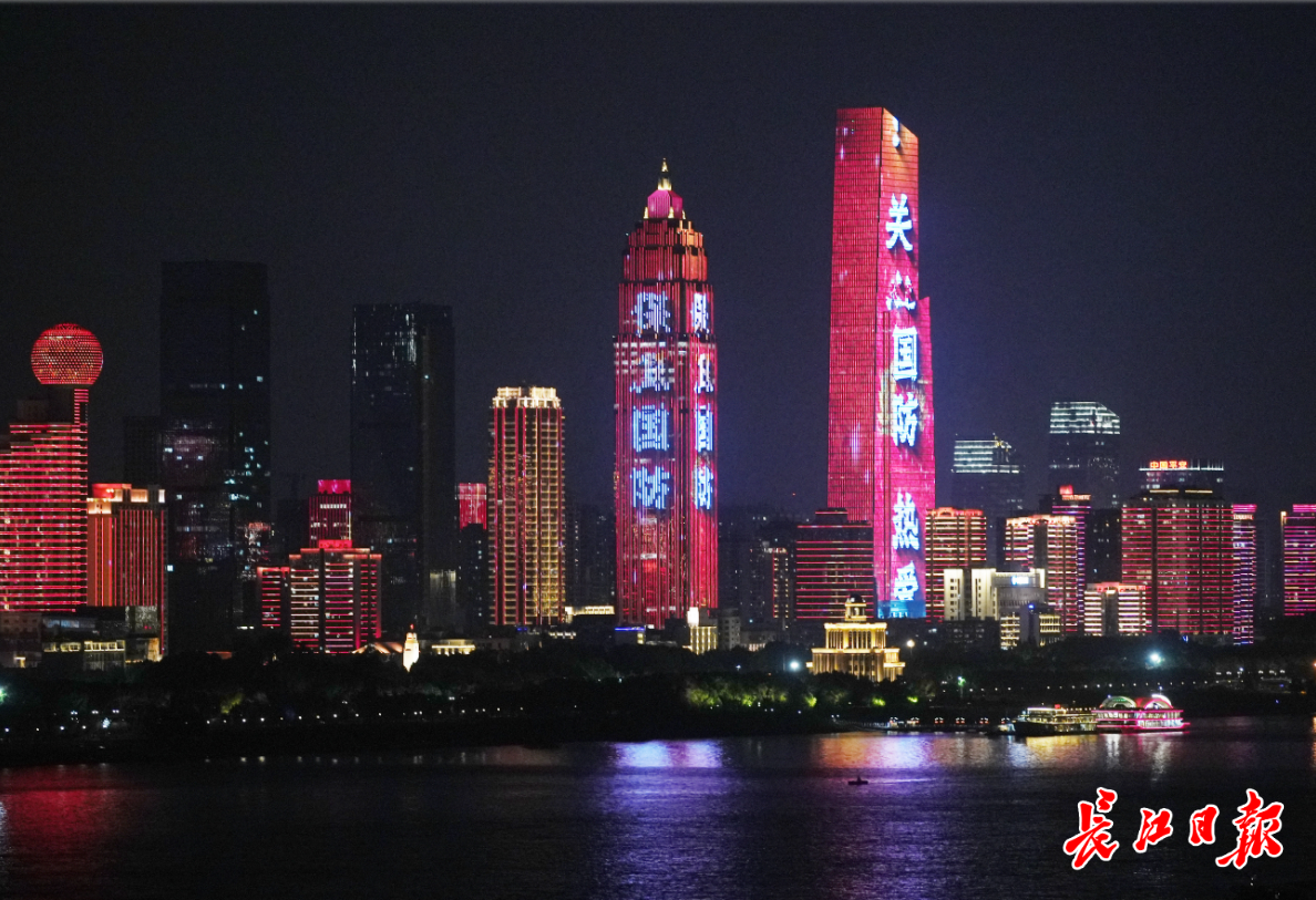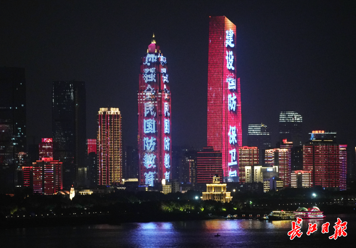 夜幕四合,长江沿线的建筑、桥体逐渐被“中国红”点亮,与长江汉水交相辉映。“热烈庆祝中国人民解放军建军96周年”“纪念延安双拥运动80周年”“加强全民国防教育,巩固军政军民团结”“关心国防,热爱国防,建设国防,保卫国防”“携笔从戎,报效祖国”“军爱民,民拥军,军民团结一家亲”等一条条宣传标语伴随冉冉升起的五角星映入市民游客眼帘,振奋人心。