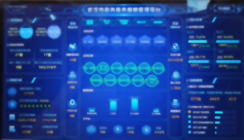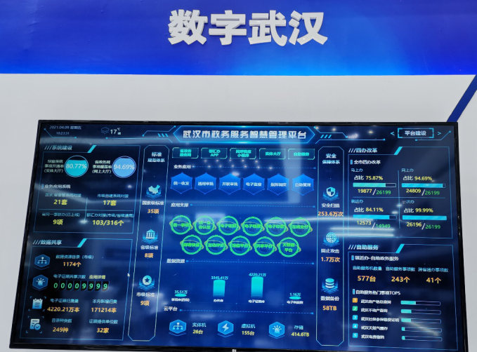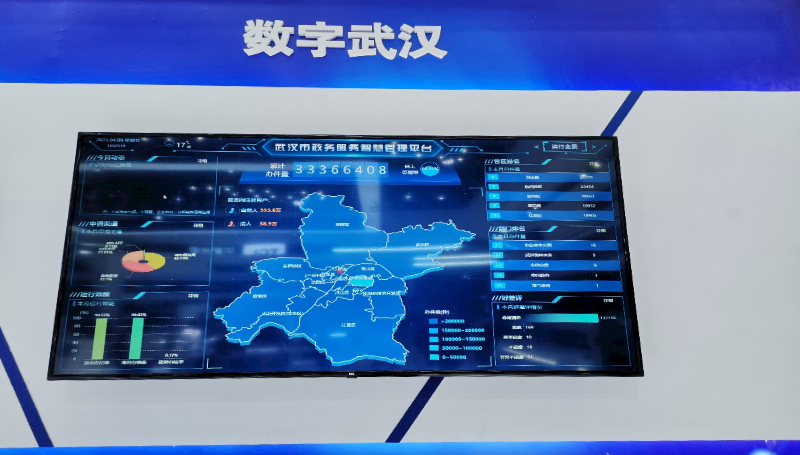 “数字武汉”展区以“武汉市政务服务智慧管理平台”为主题,分别从智慧政务、平安武汉、智慧城管、智慧医疗、智慧自然资源规划、智慧企业等多方面展示了“数字武汉”的建设成果。“数字武汉”展区采用可视化、大数据等技术,汇聚融合全市政务服务一体化平台运行状态信息及系统业务数据,通过数据和系统的全面整合和人工智能的科学分析,建立集综合监测、信息展示、指挥调度及评价评估于一体的政务服务智慧管理平台。目前已接入统一受理平台、事项管理系统、政务服务APP、政务服务自助一体机、统一行政审批系统、工程建设系统、不动产登记系统、商事登记系统等20套政务服务子系统的运行数据,实现全市政务服务运行“一张图”。