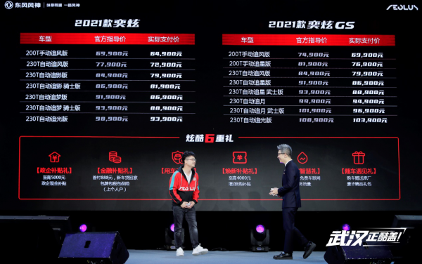 2021款奕炫共推出7款车型,实际支付价为6.49万元~9.39万元;2021款奕炫GS共推出8款车型,实际支付价为6.99万元~10.39万元。现在购车还可享金融补贴、焕新补贴等六重炫酷购车礼。