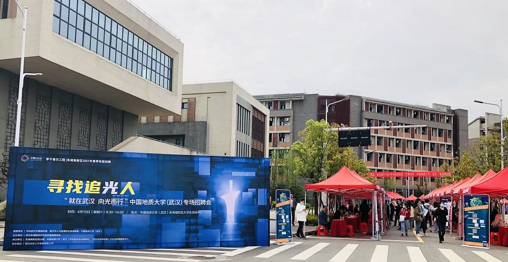 4月10日,东湖高新区才聚光谷招聘活动首次来到位于武汉未来科技城的中国地质大学(武汉)新校区,共有包括小米科技、长江存储、华工激光、字节跳动等在内的300余家优质企业现场招聘,累计提供岗位近20000个,平均月薪13000元,博士和硕士需求超过6000人。招聘会现场共有近3000人次大学生参会,现场共收到简历3550份,1000余人现场与企业达成初步签约意向。