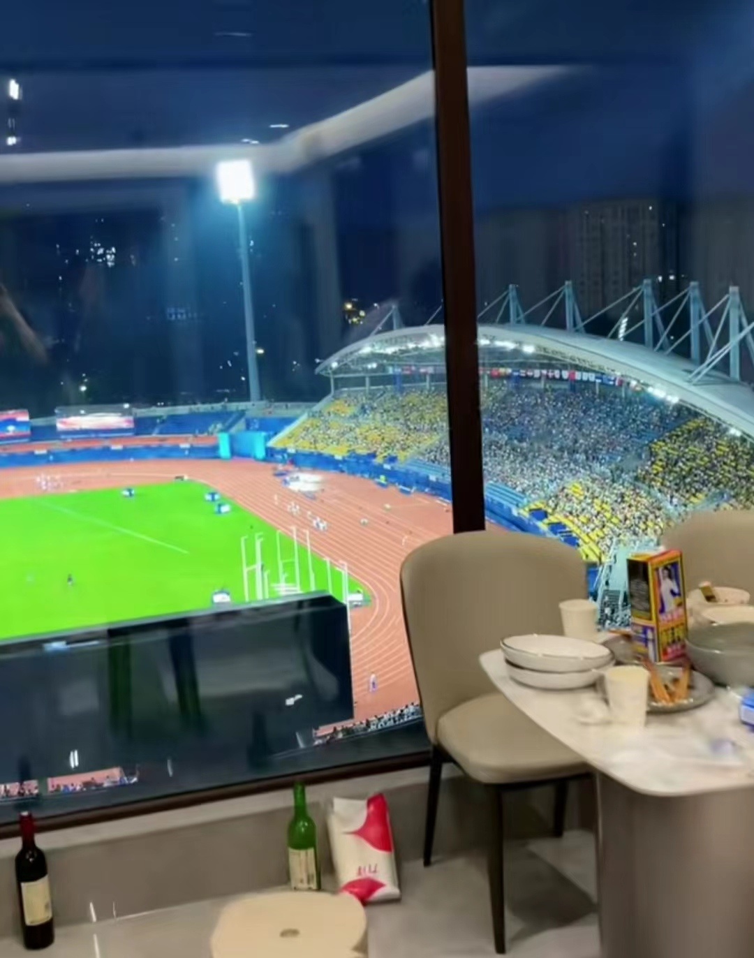 视频中,女子的家紧邻双流区体育中心体育场,这座场馆也是本届大运会田径项目的举办地,女子家所在楼层可以将露天场馆内部尽收眼底,其靠着窗边一边吃火锅一边观看赛事。视频配文“夏天最快乐的事,吹着空调吃着火锅,看着精彩的比赛。”